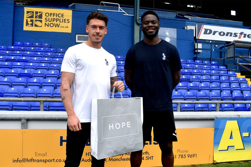 Fashion meets football with our luxury Oldham by HOPE embroidered T-shirts.